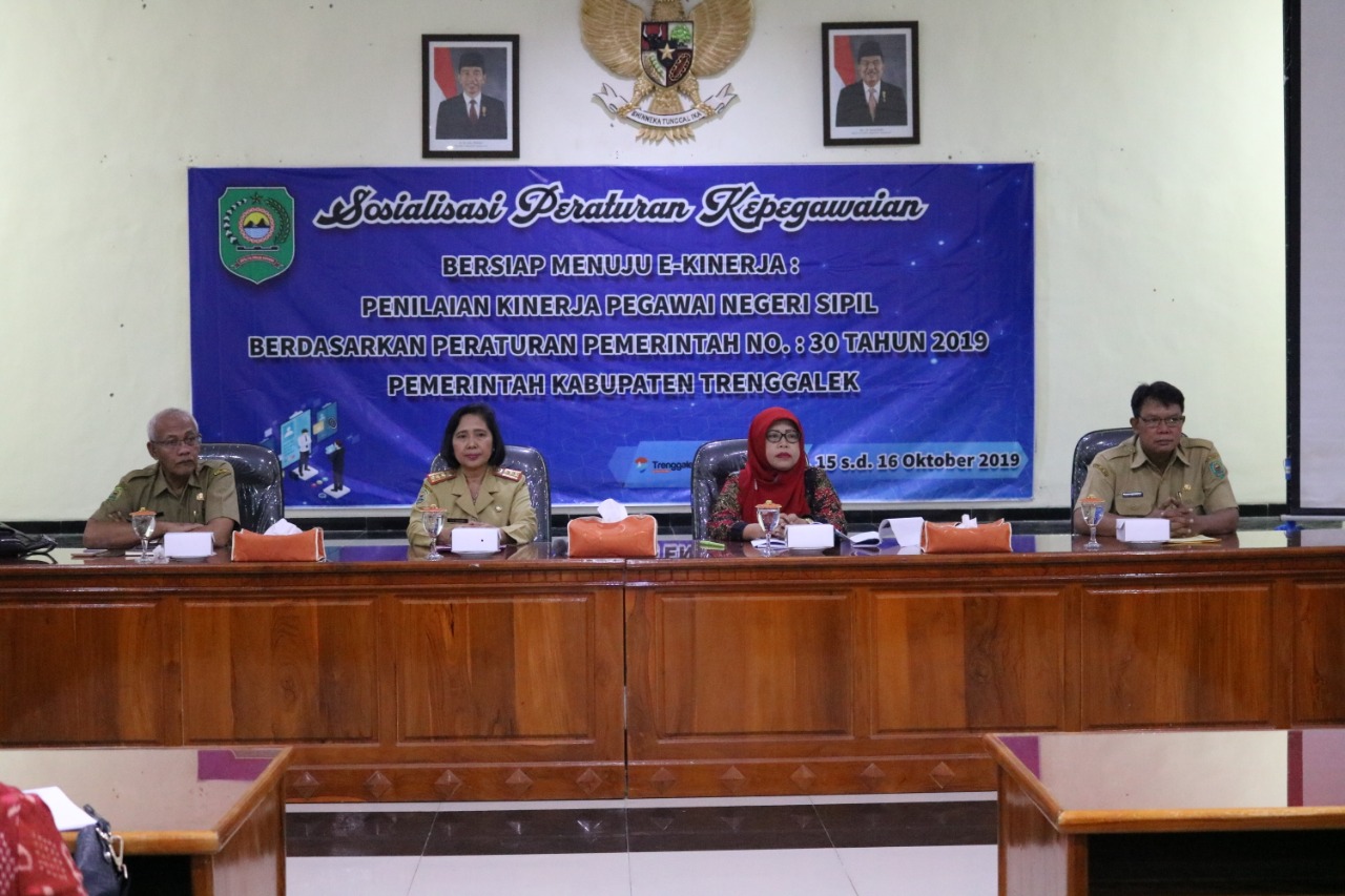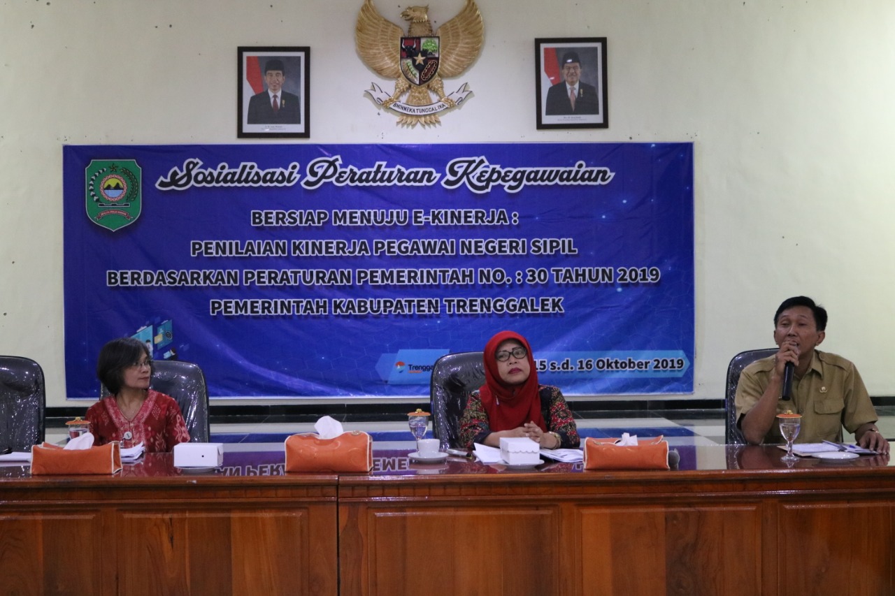 Materi Sosialisasi Peraturan Kepegawaian dengan tema “Bersiap Menuju E-Kinerja”, Penilaian Kinerja PNS Berdasarkan PP 30 Tahun 2019 yang dilaksanakan pada hari Selasa dan rabu tanggal 15 dan 16 Oktober 2019, bertempat di Lantai 2 Gedung Bhawarasa Kabupaten Trenggalek.