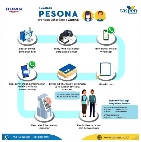 Layanan PESONA hakekatnya adalah layanan TASPEN dengan berbasis Online di mana verifikasi dokumen dilakukan dengan cara pemohon melakukan scan dokumen yang disyaratkan kemudian mengirimkan melalui aplikasi Whatsapp. Hasil verifikasi dokumen akan disampaikan melalui SMS atau Whatsapp via Handphone pemohon, dimana apabila ternyata dokumen yang disyaratkan masih kurang akan dilengkapi terlebih dahulu oleh pemohon.