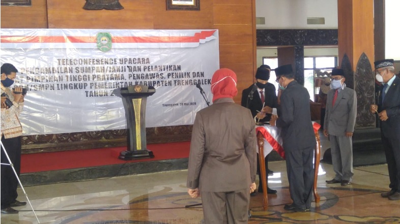 Ada yang berbeda pada prosesi pelantikan pejabat kali ini dimana keharusan menerapkan protokol kesehatan untuk mencegah penyebaran COVID-19 membuat pelantikan dilaksanakan pada 2 ( lokasi ) yang berbeda dengan penghubung teleconference. Untuk lokasi di Pendopo Kabupaten Trenggalek hanya di hadiri oleh 6 orang pejabat yang dilantik, sedangkan sisanya sejumlah 32 orang berada di aula Dinas Pendidikan ,pemuda dan olah raga Kabupaten Trenggalek . Undangan yang hadir juga terbatas, sehingga penerapan protokol kesehatan berupa pengaturan jarak antar undangan minimal 2 meter bisa terpenuhi. Walaupun menerapkan protokol kesehatan namun kekhidmatan dan kekhusukan dalam seluruh prosesi pelantikan tetap terjaga .