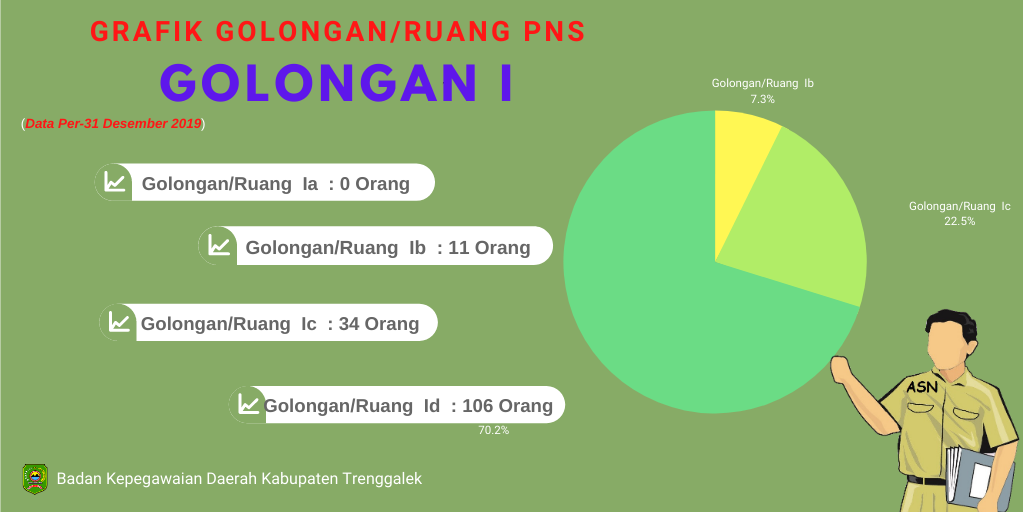 Sampai dengan akhir Desember 2019 jumlah PNS untuk Golongan/Ruang l hanya berjumlah 151 orang. Jumlah ini relatif kecil bila dibandingkan dengan Golongan/Ruang yang lain. Lebih jelasnya dapat dilihat pada infografis di bawah ini :