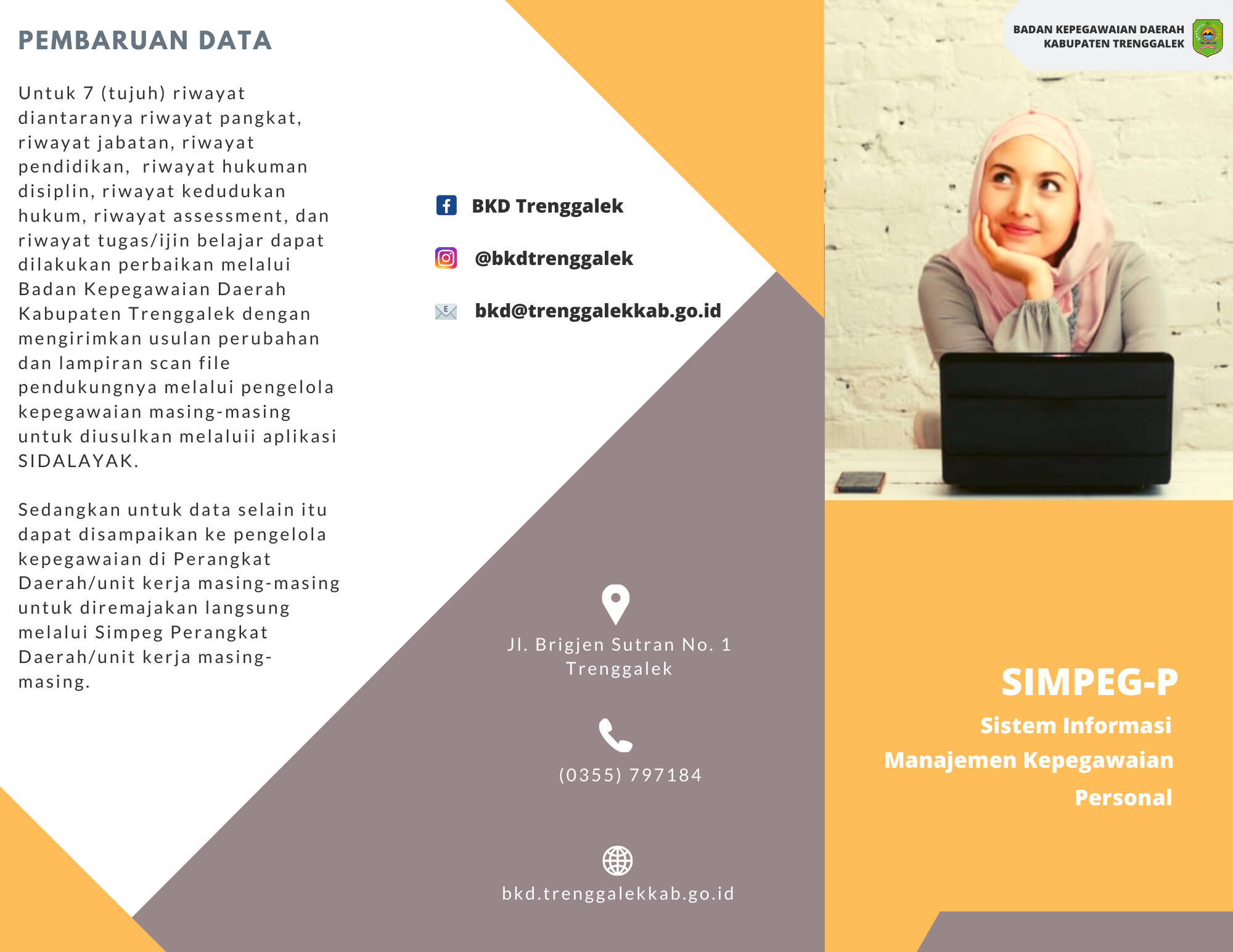 Aplikasi sistem informasi manajemen kepegawaian personal (SIMPEG-P) adalah aplikasi daring yang digunakan di lingkup Pemerintah Kabupaten Trenggalek untuk menjawab kebutuhan tersebut. Dalam aplikasi ini ada 7(tujuh) riwayat kepegawaian yang dapat di akses , yaitu :riwayat pangkat, riwayat jabatan, riwayat pendidikan, riwayat hukuman disiplin, riwayat kedudukan hukum riwayat assessment dan riwayat tugas/ijin belajar. Perubahan data untuk riwayat-riwayat tersebut dapat diusulkan kepada Badan Kepegawaian Trenggalek (BKD) Trenggalek dengan melampirkan scan file pendukung melalui aplikasi SIDALAYAK (Sistem Daring Layanan Kepegawaian).