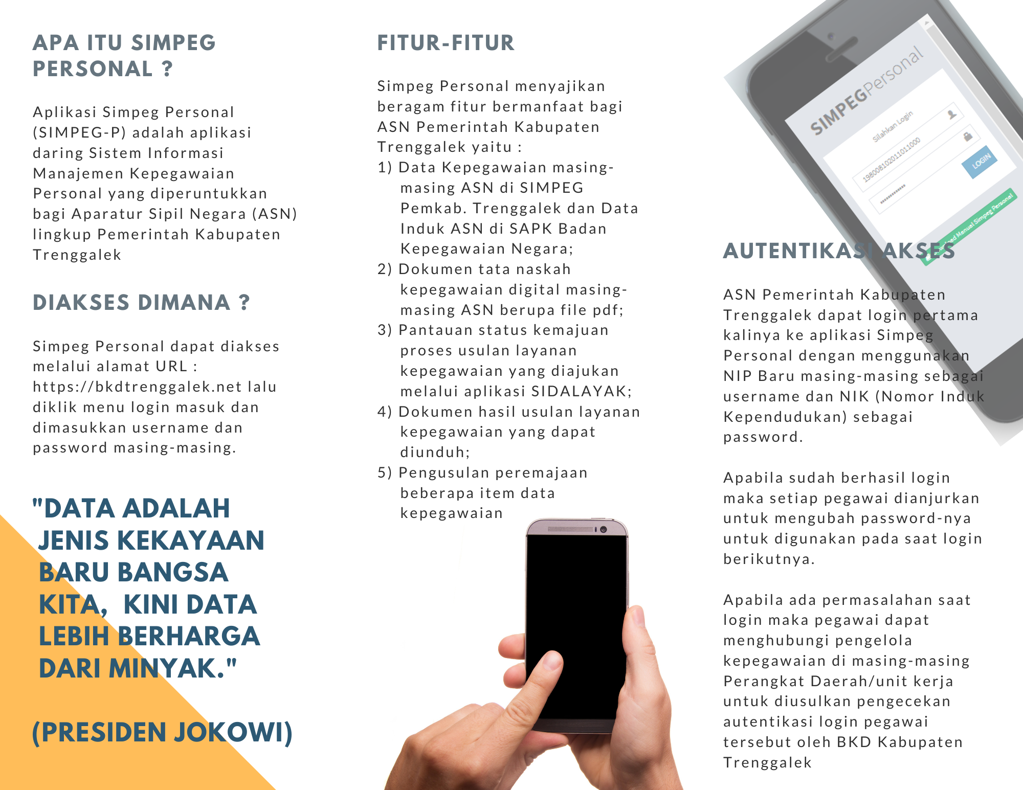 Sebagai sebuah aplikasi, SIMPEG-P dituntut untuk mudah digunakan, dan ini memang telah dipenuhi dimana untuk akses loginnya dengan mudah dilakukan melalui : https://bkdtrenggalek.net dengan menggunakan usename dan password , dimana untuk kali pertama login maka username menggunakan NIP baru, dengan passwordnya adalah NIK (Nomer Induk Kependudukan) masing-masing.