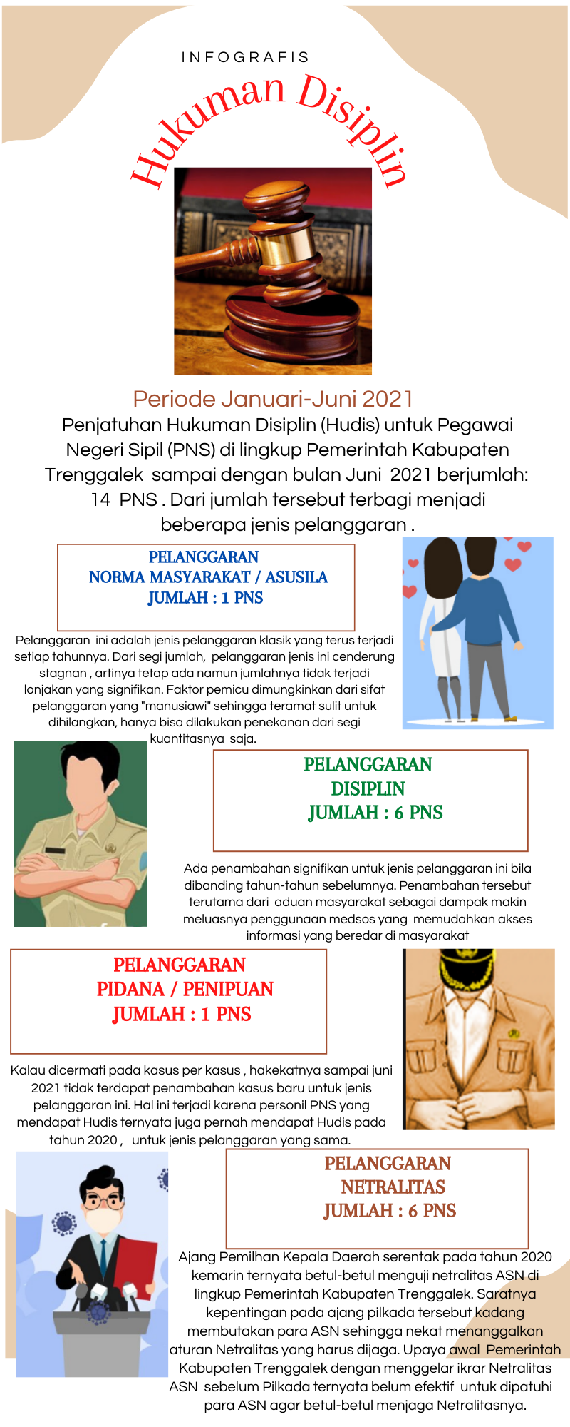 Pemaparan infografis umumnya dilakukan setelah akhir tahun, sebagai bentuk evaluasi untuk tahun berikutnya. Kebiasaan umum tersebut kali ini tidak berlaku untuk infografis Hukuman Disiplin (Hudis) untuk Pegawai Negeri Sipil (PNS) tahun 2021 dikarenakan adanya lonjakan jumlah Hudis yang telah diberikan sampai Juni 2021 dengan jumlah 14 ( Empat Belas) kasus. Jumlah tersebut sudah 2 (dua) kali lipat dari Hudis tahun 2020 , yang hanya berjumlah 7 (tujuh) kasus. Dari kasus-kasus tersebut , jumlah terbanyak adalah kasus pelanggaran disiplin dan netralitas sebanyak masing-masing 6 ( enam) kasus , sedangkan sisanya adalah masalah klasik yaitu kasus asusila sebanyak 1 (satu) kasus dan pidana penipuan sebanyak 1(satu) kasus,