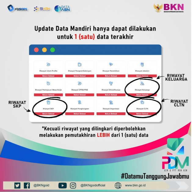 Lebih lanjut dijelaskan bahwa update data mandiri hanya diperbolehkan untuk 1 (satu) data terakhir, kecuali untuk data riwayat keluarga, riwayat SKP dan riwayat CLTN.