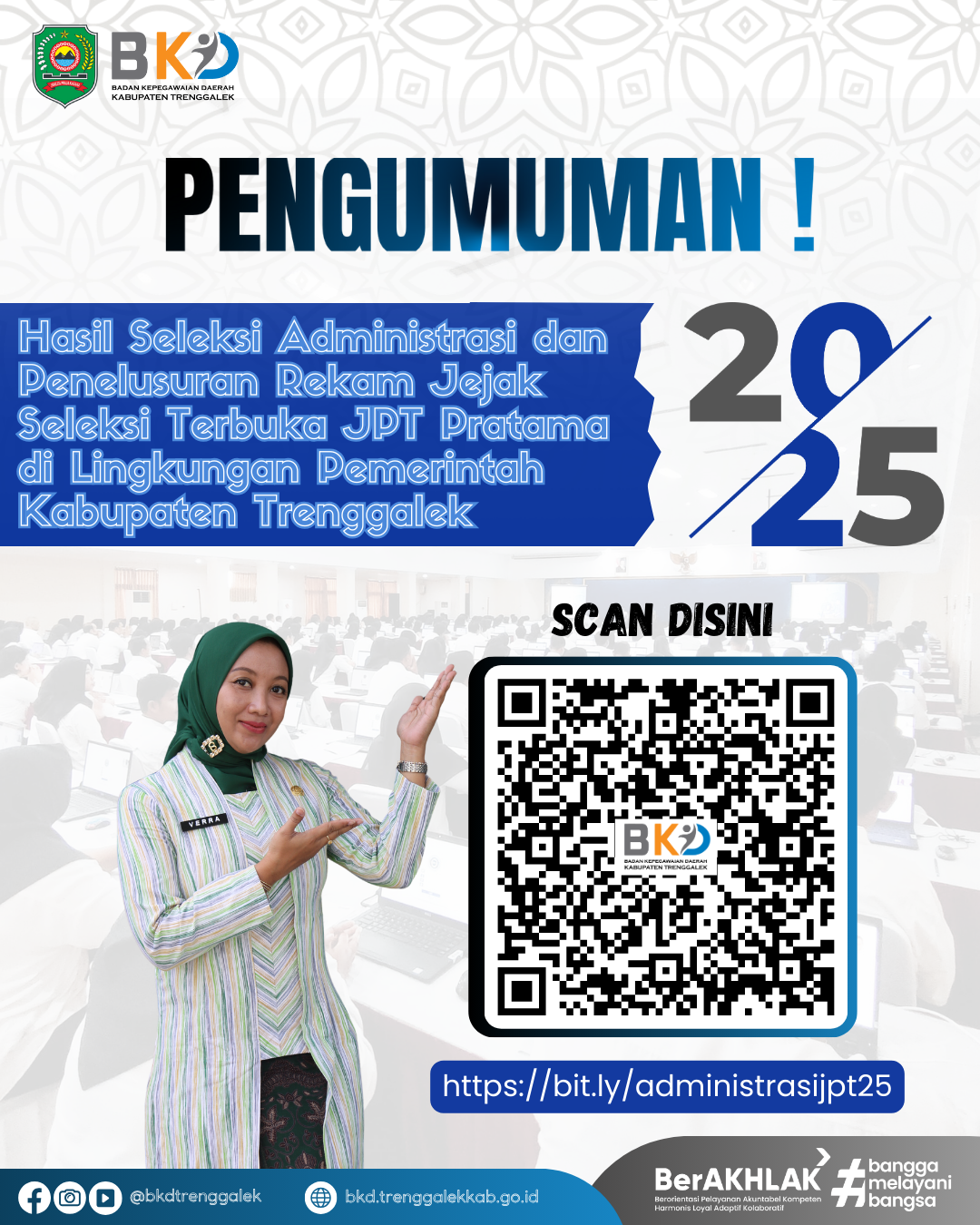 Dalam rangka pelaksanaan Seleksi Terbuka Pengisian Jabatan Pimpinan Tinggi Pratama di Lingkungan Pemerintah Kabupaten Trenggalek Tahun 2025, bersama ini kami sampaikan hasil seleksi administrasi dan penelusuran rekam jejak.