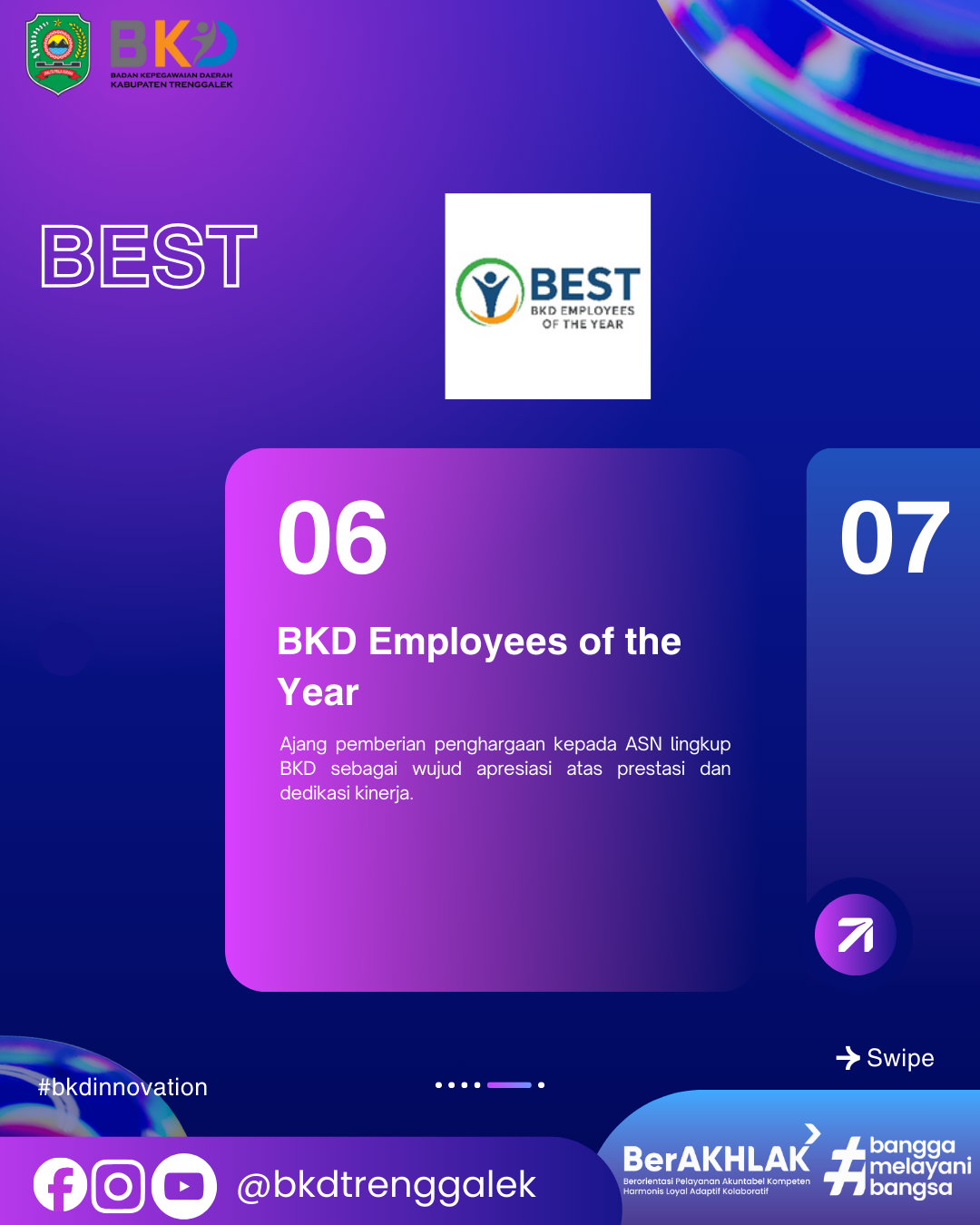 Sumber daya manusia aparatur sipil negara (ASN) merupakan aset strategis dalam menentukan keberhasilan birokrasi. Badan Kepegawaian Daerah (BKD) Kabupaten Trenggalek meyakini bahwa kualitas ASN bukan hanya ditentukan oleh regulasi atau struktur organisasi, tetapi juga oleh bagaimana motivasi, dedikasi, dan integritas mereka dihargai serta diapresiasi. Dengan semangat itulah, BKD menghadirkan inovasi BEST (BKD Employees of The Year), sebuah ajang penghargaan yang dirancang untuk menumbuhkan motivasi, memperkuat budaya kerja positif, serta mendukung agenda reformasi birokrasi.