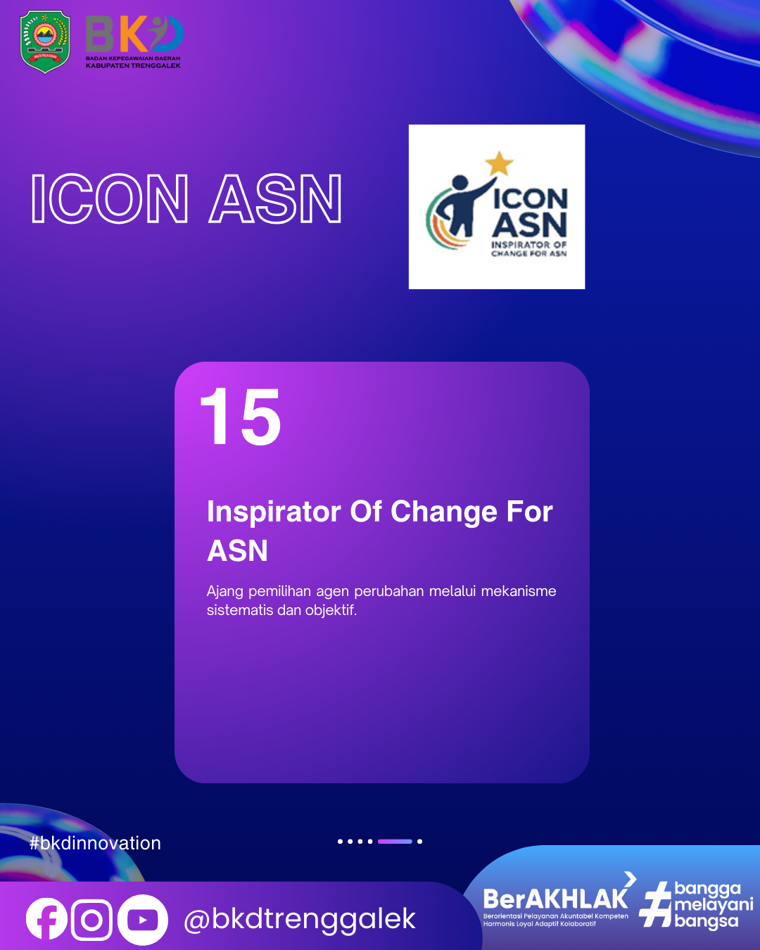 ICON ASN hadir sebagai sebuah program yang dirancang untuk menemukan dan meneguhkan figur-figur Aparatur Sipil Negara yang tidak hanya berprestasi, tetapi juga mampu menjadi teladan dalam perubahan pola pikir dan budaya kerja. Melalui ICON ASN, BKD Trenggalek ingin memastikan bahwa semangat reformasi birokrasi benar-benar hidup dalam diri ASN, bukan sekadar slogan. Program ini menempatkan agen perubahan sebagai ikon keteladanan, simbol nyata perubahan positif, dan sumber inspirasi bagi seluruh pegawai.