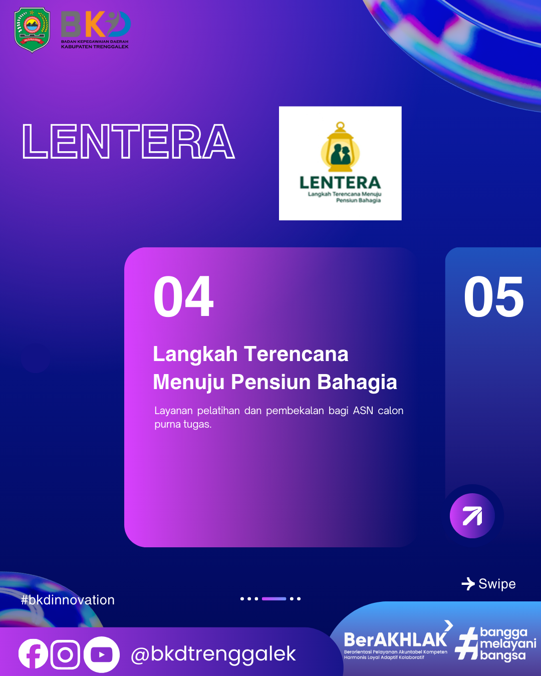 Masa pensiun merupakan fase yang pasti hadir dalam perjalanan karier Aparatur Sipil Negara (ASN). Namun, transisi menuju purna tugas sering kali membawa tantangan, baik dari sisi psikologis, kesehatan, sosial, maupun finansial. Badan Kepegawaian Daerah (BKD) Kabupaten Trenggalek memahami betul pentingnya mempersiapkan ASN menghadapi fase ini agar tetap bahagia, sehat, dan produktif. Dari kesadaran tersebut, lahirlah inovasi LENTERA (Langkah Terencana Menuju Pensiun Bahagia), sebuah program komprehensif yang menyinari jalan ASN menuju masa pensiun yang penuh makna.