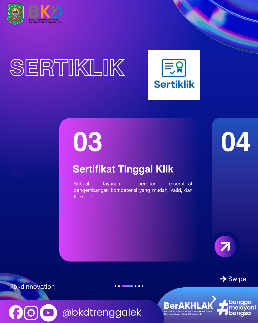 Transformasi digital dalam pelayanan publik kini menjadi kebutuhan mendesak di tengah tuntutan masyarakat akan layanan yang cepat, efisien, dan transparan. Badan Kepegawaian Daerah (BKD) Kabupaten Trenggalek menjawab kebutuhan tersebut dengan menghadirkan inovasi SERTI-KLIK (Sertifikat Tinggal Klik). Inovasi ini merupakan sistem penerbitan sertifikat berbasis digital yang memanfaatkan teknologi informasi untuk mempercepat, memudahkan, serta mengamankan proses penerbitan sertifikat kegiatan, mulai dari pelatihan, bimtek, seminar, hingga pengembangan kompetensi Aparatur Sipil Negara (ASN).
